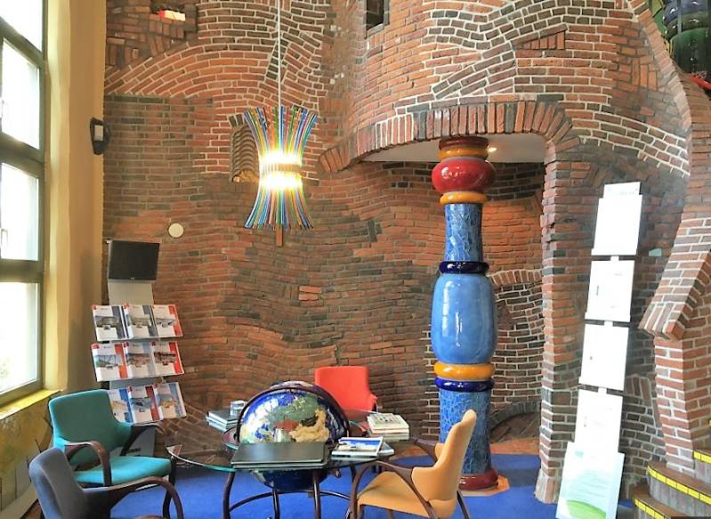 Om 14.00 uur worden wij begroet door ons lid Gerard aan de Stegge, die ons zal rondleiden door het bedrijf. We staan onder prachtige weersomstandigheden het gebouw van buiten te bewonderen. Gerard legt ons uit hoe hij de gronden heeft verworven en hoe het idee is ontstaan om een kantoorgebouw in de stijl van de Oostenrijkse architect Hundertwasser te bouwen. Bijna niets is recht alles is zeer variabel gemetseld, afgewerkt en vooral veelkleurig. De eigen bouwvakkers hebben de klus zelf geklaard en hadden vrijwel de vrije hand om te metselen en of tegels te zetten. Na de koffie met heerlijke cake worden we rondgeleid door de enorme hallen en zien wij hoe grote pijpen gelast en bestraald worden, Deze worden vooral gebruikt bij het bouwen van waterzuiveringen. Ook bezoeken we de afdeling Triogen waar generators gebouwd worden die warmte terug winnen en kant en klaar in een container worden geplaatst en verscheept worden naar ergens in de wereld. Na afloop nodigt Gerard ons uit om samen met hem te toasten op zijn verjaardag. We gaan terug naar de stad en genieten op het terras heerlijk van een biertje. Gerard geweldig bedankt voor het ontvangst, de rondleiding en traktatie