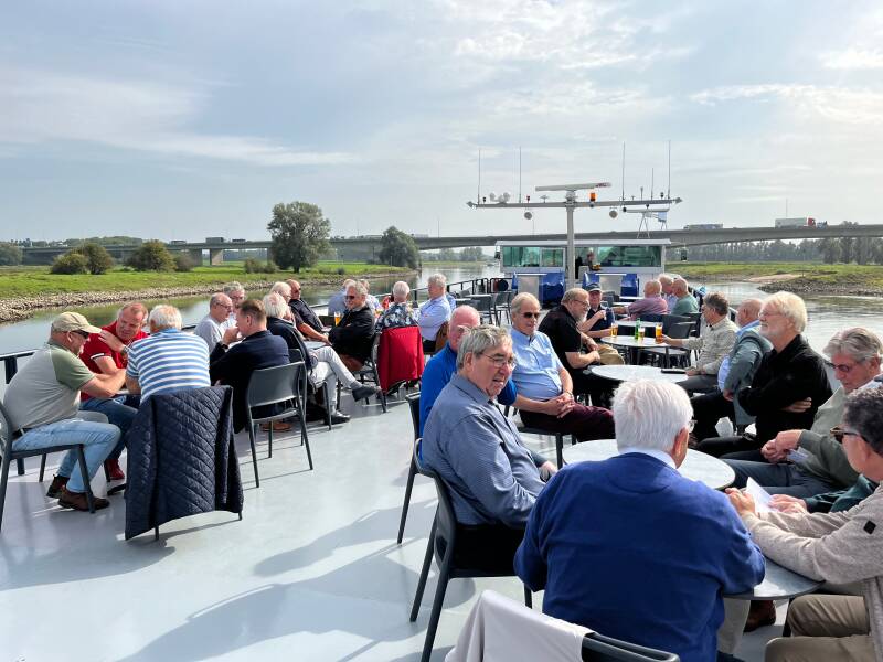 Zodra we aan boord van de Nirvana waren, werden we hartelijk verwelkomd door kapitein Erwin Scheers en zijn bemanning. De trossen werden losgegooid, en we voeren de IJssel op richting Zutphen. Gelukkig werkte het weer mee, en de leden van de Sociëteit genoten van het prachtige uitzicht langs de IJssel vanaf het zonnige dek, onder het genot van enkele verfrissende drankjes.